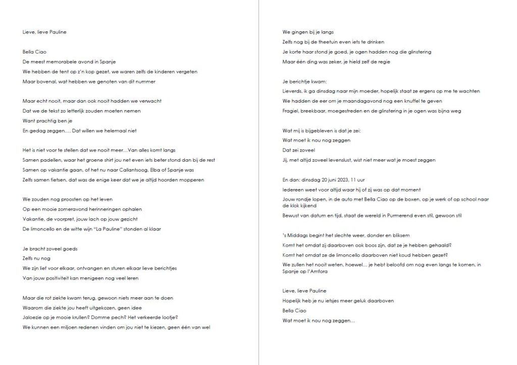 Lieve Pauline, je was geliefd en je wordt zo gemist door iedereen. En ondanks dat ik jouw niet wil missen ben ik blij dat ik jou gekend heb. En met alle lessen die we van je hebben geleerd.